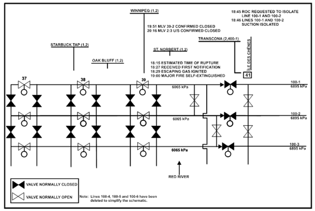 At 1845, 27 minutes after the first notification to 911 of an occurrence, the Calgary Controller instructed the ROC to isolate Lines 100-1 and 100-2 between station No. 34, at Portage la Prairie, Manitoba and station No. 41, at Île des Chênes, Manitoba. The ROC first isolated the station No. 41 suction side of Lines 100-1 and 100-2 and then isolated the station No. 34 discharge side of Lines 100-1 and 100-2. The Île des Chênes compressor station No.41, which was occupied by TCPL personnel, is about 30 km by highway from the occurrence site.