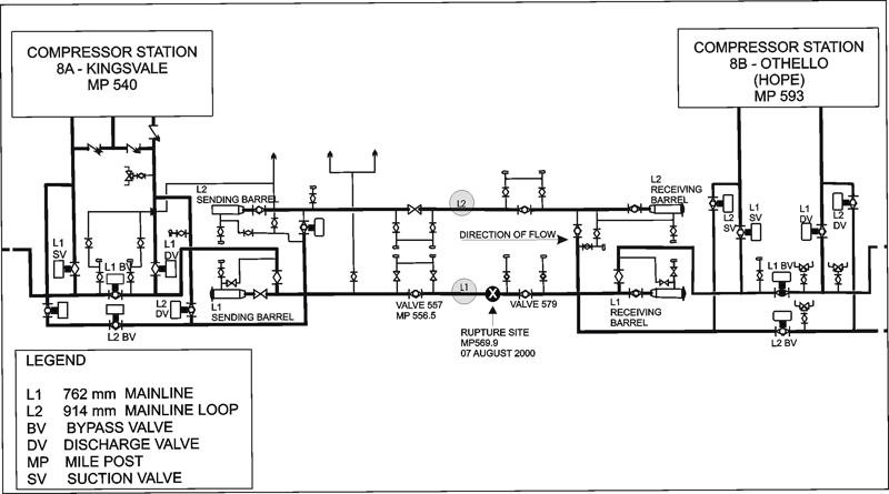 Although a rupture should have resulted in a rate of pressure change equal to or greater than 207 kPa per minute, the rate of pressure change at Compressor Station 8B never reached this alarm situation. This was probably due to a combination of the pipeline configuration between Compressor Stations 8A and B, spare horsepower at Compressor Station 8A, Compressor Station 8B being bypassed, and the location of the rupture. The first two factors probably created a large flow reversal on the mainline at Compressor Station 8B and a large flow increase on the mainline loop. Currently, Westcoast's line break detection system has not been configured to signal a rupture based on changes in flow rate.