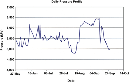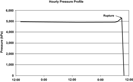 A review of the SCADA trend logs for compressor stations 110 and 112 indicated that, in the 5 months prior to the occurrence, no unusual operating event had taken place in this section of the pipeline (see Figure 5).