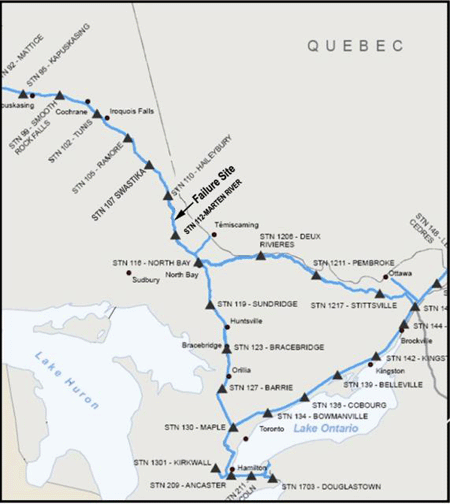 Shortly thereafter, Gas Control received telephone notification from the Ontario Provincial Police on its Emergency Hot-Line that a pipeline failure had occurred approximately 700 metres upstream of Compressor Station 112, located near Marten River, Ontario (see Figure 2).