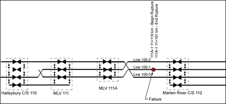 At 1147, SCADA telemetry indicated abnormal and falling pipeline pressures upstream of Compressor Station 112, with an associated low pressure alarm in Calgary Gas Control (Gas Control) on Line 100-1. At 1151, TransCanada's Main Line Valve (MLV) 112-1, located upstream of Compressor Station 112, closed automatically as its low pressure shut-off was triggered. This MLV is a 30-inch diameter full opening ball valve that can be operated automatically from the station control room, remotely by Gas Control, or locally by hand, if required. When MLVs are equipped with an automatic low pressure shut-off control sensing (LPSOCS) system, the valve will automatically close when a low pressure situation is detected in the pipeline. Using the SCADA telemetry system, the Gas Control operator (the operator) verified that there had been a pipeline break on Line 100-1 in Northern Ontario.