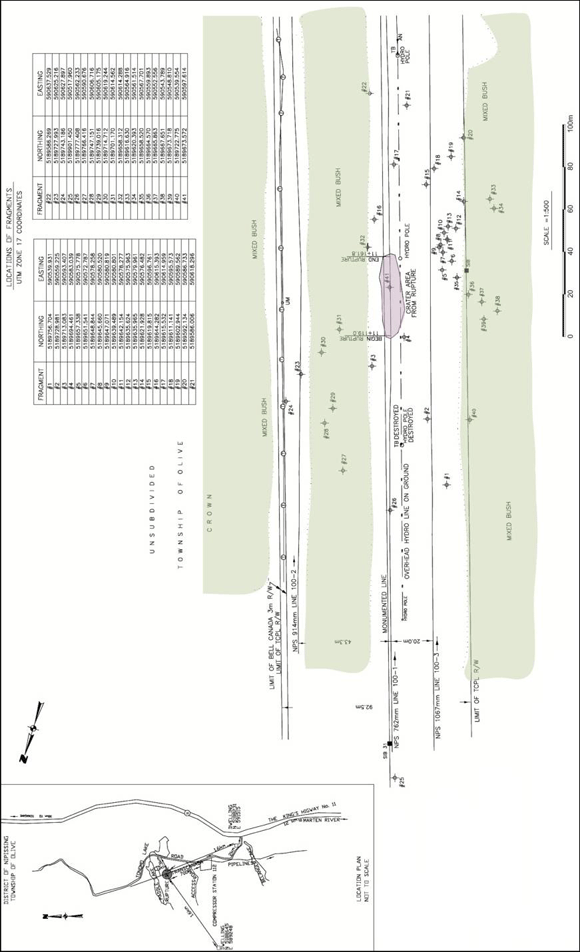 Numerous pieces of pipe were ejected onto the pipeline right of way and into the adjacent forested area. Figure 4 identifies the locations where pipe pieces were found.