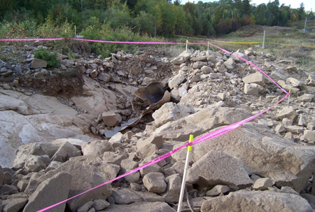 The failure on Line 100-1 occurred in an area of bedrock within MLV-111A section. This pipeline was covered with a sand pad protection onto which a bedrock of fractured granite had been laid. The granite cover was blasted out at the time of construction in the late 1950s and was subsequently reused to bury the pipeline. The local area is characterized by a series of undulating depressions that are mostly poorly drained organics over bedrock and upland bedrock areas.