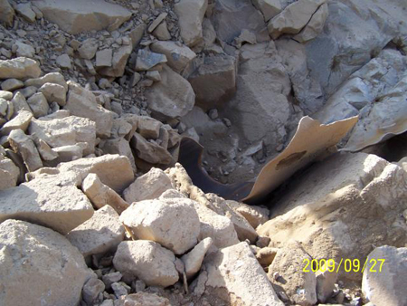 During the rupture, a section of pipe separated from the pipeline and was scattered throughout the area in more than 40 pieces of varying sizes (see Photo 1). The upstream and downstream joints of the pipe were severely damaged (see Photos 2 and 3). Pieces of pipe were found up to approximately 100 m away from the site of the rupture.