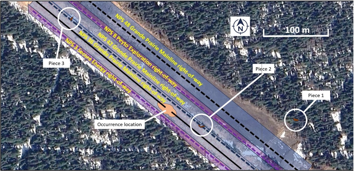The NPS 36 Grande Prairie Mainline was exposed at both the upstream and downstream ends of the ruptured section. Three large pipe piecesThe pieces were identified as Piece 1, Piece 2, and Piece 3. that were ejected during the rupture were located in the vicinity of the crater (Figure 4). All of the ejected pipeline material, approximately 20 m, was recovered. The largest piece, which included the rupture origin, was located 200 m east of the occurrence location (Figure 5). No damage to other nearby NGTL or third-party infrastructure was reported.