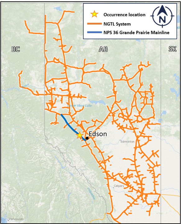 The occurrence took place on a right-of-way used by NGTL (Figure 1). The nearest town to the occurrence site is Edson, Alberta, which is located approximately 36.5 km to the southeast.