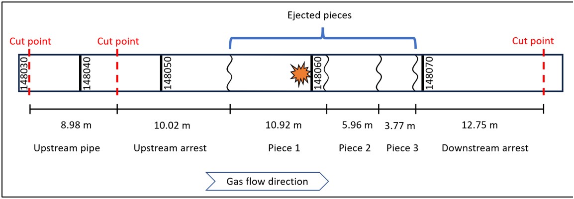 Three ejected pipe pieces were secured on site at the occurrence location. Sections of pipe, including where the fracture stopped propagating, were excavated and cut out. The recovered pipe material was from pipe jointsA pipe joint is a section of pipe between two girth welds. Joints on the NPS 36 Grande Prairie Mainline are identified by the upstream girth weld number. 148030 to 148070 (Figure 7). The ejected pieces, cut-out pipe sections, and soil samples were sent to Acuren Laboratories in Edmonton, Alberta, to determine the mechanical properties of the pipeline and its mode of failure.
