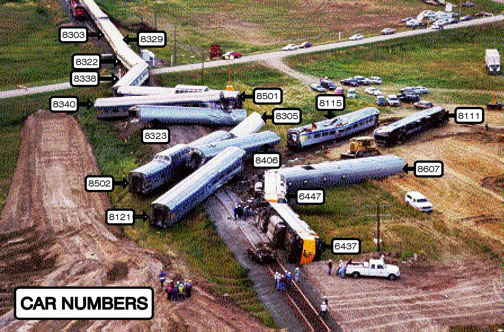 On 03 September 1997, at approximately 0150 mountain daylight time, VIA Rail Canada Inc. Train No. 2, travelling eastward at 67 mph, derailed at Mile 7.5 of the Canadian National Wainwright Subdivision, near Biggar, Saskatchewan. Thirteen of nineteen cars and the two locomotives derailed. Seventy-nine of the 198 passengers and crew on board were injured, 1 fatally and 13 seriouslyFootnote 1. Approximately 600 feet of main track was destroyed.