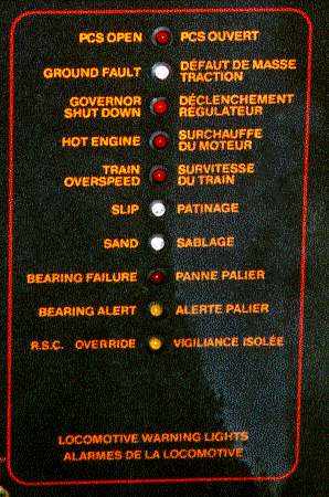 Engr 1 first went into the cab of the second locomotive (6437) and then into the cab of the third locomotive (6447) where a warning light was illuminated on the overhead console warning light panel. Without his reading glasses, he could not make out the text adjacent to the light on the panel. He radioed the second locomotive engineer (Engr 2), and from the description provided, Engr 2 concluded that the illuminated light corresponded to the "Bearing Alert" indication on the panel (Figure 3).