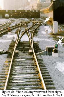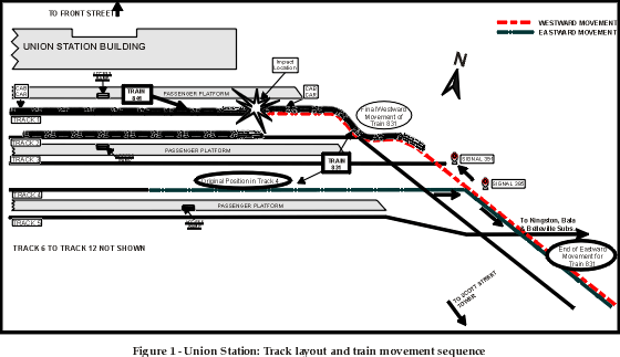 Commuter train No. 831 (train 831), scheduled to arrive in track No. 1 at 1616 at Union Station, had no passengers and was stopped in track No. 4. At approximately 1610, train 831 pulled eastward out of track No. 4 and stopped clear of signal No. 391 and signal No. 385 (see Figure 1). The train waited several minutes at this location for the Scott Street tower train movement director (TMD) to line the switches for the intended westward movement into track No. 1. When the signals changed from red to yellow, the conductor, who was controlling the movement while positioned in the leading car, noted that track No. 1 appeared to be clear. At approximately 1614, the conductor relayed to the first locomotive engineer, via intercom, that the signal lights had changed and that it was now permissible to reverse the movement into track No. 1. The signal aspect and the distance to reverse were not discussed between the two crew members. The first locomotive engineer then began to reverse the train into track No. 1. As the train was moving slowly along the track, the first locomotive engineer contacted the conductor, via intercom, and they had a brief discussion about the specific location to spot the train in track No. 1. The conductor stated that, during the westward movement towards track No. 1, he had taken his coat off, sat down in the cab carFootnote 2, turned on the bell and dimmed the lights. Nearing the platform area, he realized that there was a train standing in track No. 1, approximately 200 feet away.