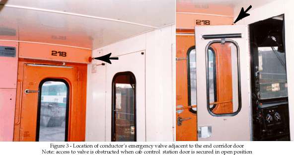 Each of the 329 coaches is equipped with four conductor's emergency valves, which are used for initiating an emergency brake application. In each cab car, there is an additional conductor's emergency valve located in the aisle adjacent to the cab control station. Access to the conductor's emergency valve is obstructed when the door to the cab control station is left in the open position (see Figure 3).