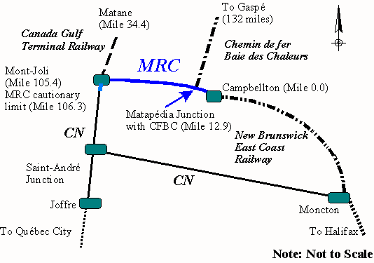 The MRC is a short line railway under federal jurisdiction which operates between Mont-Joli, at Mile 106.3, and Tide Head, New Brunswick, at Mile 4.7 of the Mont-Joli Subdivision. The MRC connects to the CN main track at Mile 106.3 and the New Brunswick East Coast Railway (NBEC) at Tide Head, near Campbellton, New Brunswick. The Chemin de fer Baie des Chaleurs (CFBC) had an agreement with the MRC allowing the CFBC running rights to Campbellton.