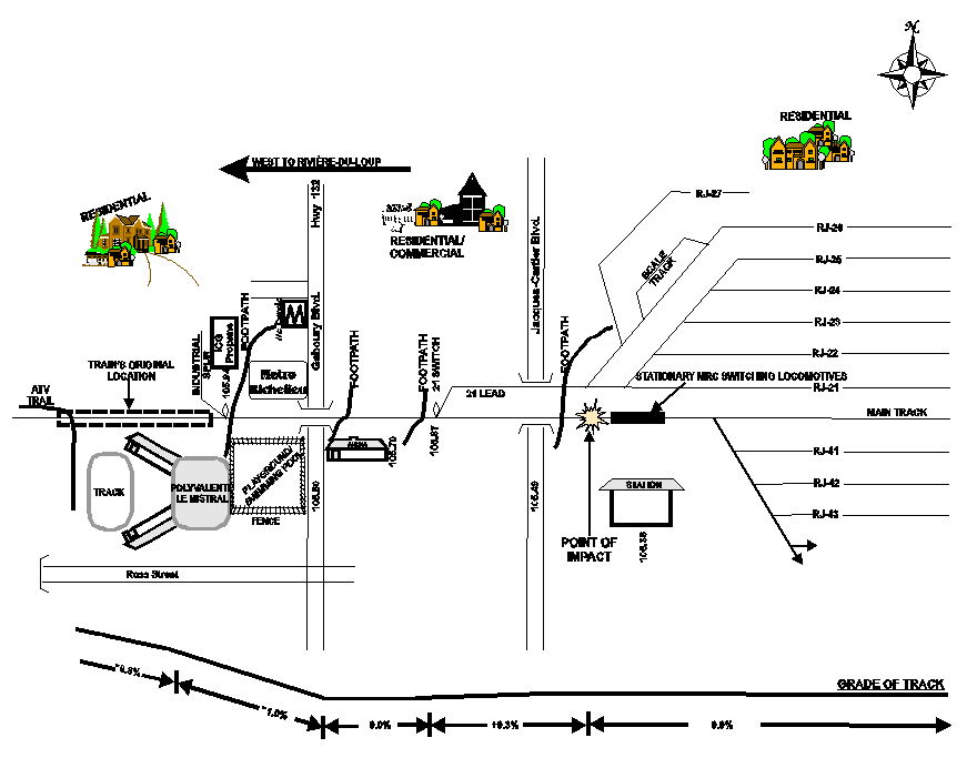 North of the MRC track, there is an industrial park which houses a liquid propane-handling facility, the local school bus company garage as well as several other commercial facilities. There is a residential area immediately beyond the industrial park and a popular fast-food restaurant located on Gaboury Boulevard.
