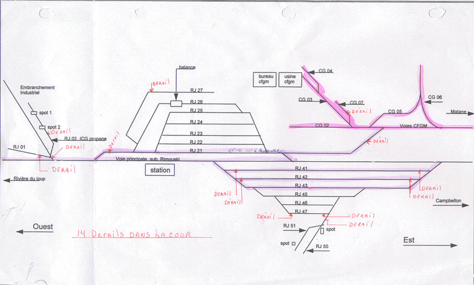 The formal agreement between the MRC and CN designated two specific yard tracks (RJ-41 and RJ-42) for the interchange of rail cars between the two railways. Both of these tracks were relatively flat with derail protection at both ends. CN also had running rights on track RJ-21, the designated siding (RJ-43), as well as the CGTR "wye" tracks (CG-05 and CG-06, Appendix C). Many of those same tracks were also used for interchange of traffic between the MRC and CGTR.