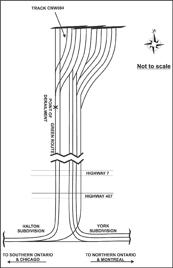 On 26 November 1998, at approximately 0645 eastern standard time (EST)Footnote 1, Canadian National (CN) train No. M333-31-26 (the train), departing MacMillan Yard, crossed over from track No. CNW004 onto the Green Route track (the crossover). A train-initiated emergency brake application occurred. Once the train came to a stop, the conductor detrained and observed that three tank cars had derailed: tank car PLMX 3447 had rolled down a 20-foot embankment to the west of the tracks, tank car UTLX 92367 was lying on its side, and tank car PLMX 4651 had remained upright. There were no injuries.