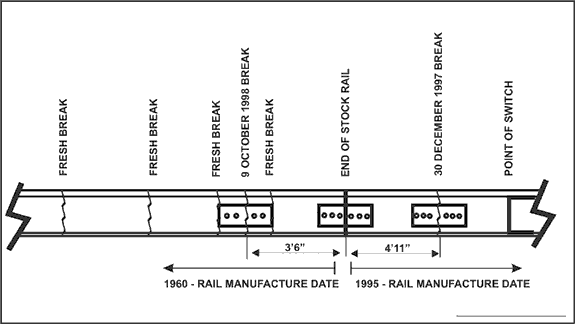 Immediately south of the crossover switch point, the rail had a previous fracture that had been observed on 09 October 1998. The adjacent rail length also had been fractured on 30 December 1997.
