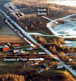 At approximately 0900 eastern standard time (EST)Note de bas de page 1 on 09 November 1999, VIA Rail Canada Inc. (VIA) westward passenger train No 85 (VIA 85), consisting of one locomotive and four passenger coaches, derailed 15.3 miles east of Guelph, Ontario, after colliding with a dump truck on the Fourth Line Road public level crossing. The truck was observed to accelerate as it approached the crossing. It is not known whether the driver looked along the railway line as he approached the signals.