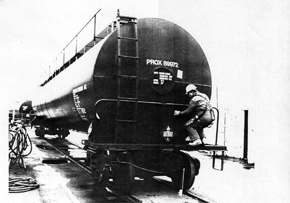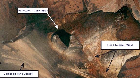 The jacket of ammonia car PROX 81179 was badly scorched due to fire. Except for a residual amount (heel) of refrigerated product remaining in the car, the car lost most of its contents within eight hours of the derailment. The majority of the ammonia burned off rather than forming a gas cloud. Figures 4, 5 and 6 show some of the fire damage on the exterior of the tank and the frosting due to the refrigerated heel. Twelve hours after the derailment, there were about 10 inches of product left in the tank car as indicated by the frost line. In the bolster areas of the car, the frosting peaked at higher levels due to higher thermal conductivity in that zone.