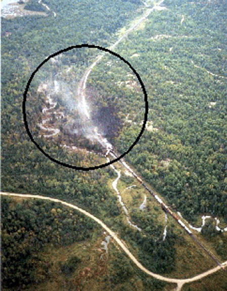 A crater in the right-of-way measuring approximately 2 m deep, 3 m wide and 15 m long was created by the LPG fire and subsequent violent rupture of the tank, which destroyed the roadbed and altered the physical state of the soils and other materials in the area. A box car immediately west of the LPG tank was crushed and bent 90 degrees. The main track and adjacent siding track were moved laterally and destroyed. Debris of demolished rail cars was strewn about the derailment. The adjacent trees and earth were scorched black for a radius of approximately 200 feet. Aerial photographs show the effect that the ensuing fireball and chemical release had on the vegetation surrounding the derailment location (see Figure 3).