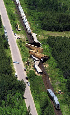 The train derailment area (see Figure 1) extended for approximately 850 feet. The two passenger cars, 8th and 9th behind the locomotive, were derailed in an upright position. The 10th, 11th and 12th cars, flat cars loaded with packaged lumber, were coupled together and lying on their sides to the south of the track. The 14th, 15th and 16th cars, centre beam flat cars loaded with lumber, and the 17th car, an empty hopper car, were upright and jack knifed on the right-of-way. The 18th, 19th and 20th cars, also flat cars loaded with packaged lumber, were lying on their sides to the north of the track. The 13th car, an open top gondola car loaded with used railway ties, although upright, had the leading end of the car torn away. Two TCPL natural gas pipelines cross about 2 m underneath the railway where the 19th and 20th cars were lying on their sides. The top corners of the cars had penetrated the ground surface to an approximate depth of 75 cm.