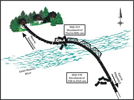 At about Mile 9.5, the train experienced an undesired emergency brake application. The event recorder indicates that, at the time of the emergency brake application, the train was travelling at 29 mph and the throttle was in the No 2 position. After the train came to a stop, the crew carried out the emergency procedures prescribed by regulations and the conductor went to the tail end to determine the cause of the emergency brake application. He found that 13 gondola cars (11th to 23rd cars), loaded with wood chips, had derailed at Mile 9.58. Canadian National (CN) subsequently received a call indicating that one tank car was floating in the Saint-Maurice River. Personnel at the site discovered that nine other cars (72nd to 80th cars), including two covered cars loaded with paper, one empty hopper car, and six empty tank cars that had recently contained gasoline (UN 1203) or heating oil (UN 1202), also had derailed on the bridge over the Saint-Maurice River at Mile 10.15 (see Figure 1). Two tank cars were punctured, but only a minimal quantity of product spilled into the river. No one was injured as a result of the accident.