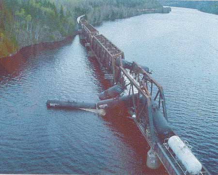The hopper car and the empty tank cars were placed near the middle of the train (74th to 80th cars). The weight ahead of these cars was approximately 7 000 tons, and the weight behind was approximately 8 700 tons. The hopper car and three tank cars fell off the bridge and another tank car was left hanging from the bridge structure (see Figure 2). The hopper car was a cylindrical pressure-flow car with three outlet valves and no centre sill, and was constructed of 3/16-inch plate, Class AAR C-612.