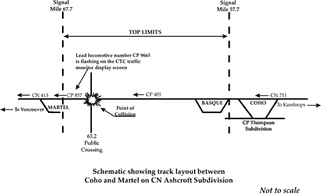 After a westward CPR train with lead locomotive No. CP 9665 (CP 857) cleared his location, the foreman reported the train's passing to the RTC at 1224. The RTC advised him that he could only have the main track for about 40 minutes, as another westward train (CN 711) would be approaching Coho at about 1310. The RTC then issued a TOP to the foreman to occupy the main track between Signal 577 at Basque and Signal 677 at Martel behind CP 9665 West (CP 857) that had left Mile 65.2 at 1224. The TOP also contained an instruction to call the RTC before 1310. The TOP was copied and repeated by the foreman and made complete by the RTC at 1227. All four MOW crew members, including the foreman, read and initialled the TOP, indicating that they understood its contents. Figure 2 depicts the area covered by the TOP limits.