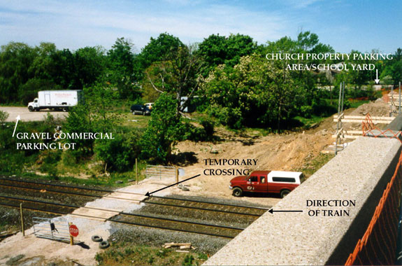 To prepare the site for construction activity and to provide access to the tracks, the embankment along the west side of Guelph Line Road had been modified by adding earth fill. The fence at the rear of the church property, parallel to the overpass and north of the tracks, was replaced by a 1.3-metre-high orange plastic snow/security fence that extended alongside the property, southward to within 61 metres of the track. A construction access road ran between this fence and the overpass embankment. The plastic fence was partially pushed down in some areas, including immediately adjacent to the school yard.