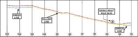 - if three locomotives were enabled in DB, and DB was applied and fully maintained from 25 mph at the top of the hill, the train would have been almost stopped at about Mile 97.3, before reaching the derailment location.