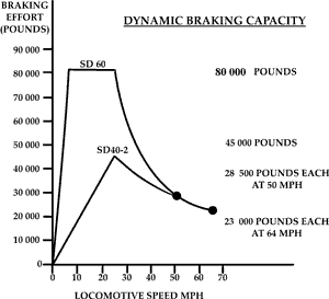 DB capacity is expressed in pounds of force (see Figure 2). DB is most effective at retarding a train under 25 mph. The combined DB capacity of the two locomotives declines from 125 000 pounds at 24 mph to approximately 57 000 pounds at 50 mph, and further declines to approximately 46 000 pounds at 64 mph.