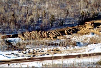 On 08 January 2001, Canadian Pacific Railway (CPR) train 308-001 (train 308) departed Thunder Bay, Ontario, Mile 132.9 of the Nipigon Subdivision, at 1050 eastern standard time.Footnote 1 At about 1330, the eastward train experienced a train-initiated emergency brake application at Mile 94.297 while descending a 0.55 per cent grade, west of Bowker, Ontario. The train was travelling at 64 mph in a maximum allowable speed zone of 50 mph. After emergency procedures were executed, inspection of the train revealed that a total of 59 cars had derailed, the 12th car and the 19th to 76th cars, inclusive. The north and south rails were fractured within a few metres of the initial point of derailment (POD) at Mile 94.65. Initial examination of the POD revealed that the track had spread, the high rail canted over and the wheels dropped between the rails, resulting in a derailment. The head end of the train, with 19 cars, travelled approximately 4500 feet after the derailment occurred. The 12th car and the 19th car were derailed and upright on the roadbed. The 20th to 24th cars were derailed and on their side to the south of the track, approximately 2000 feet behind the head end of the train. The 25th to 76th cars were derailed in an accordion fashion on the right-of-way for a distance of 1085 feet east of the POD (see Photo 1).