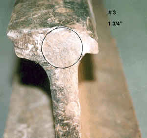 Both ends of the 67-inch rail section, which contained the earlier break, also displayed transverse detailed fractures from shelling. The fracture at the east end had a visible defect that reached a depth of ½ inch, or about 5 per cent of the rail head's cross-section. A brittle fracture originated from the boundary of the defect and spread through the remainder of the rail's cross-section. Since there was no rail end batter, this fracture was identified as secondary, resulting from abnormal loading following the derailment.