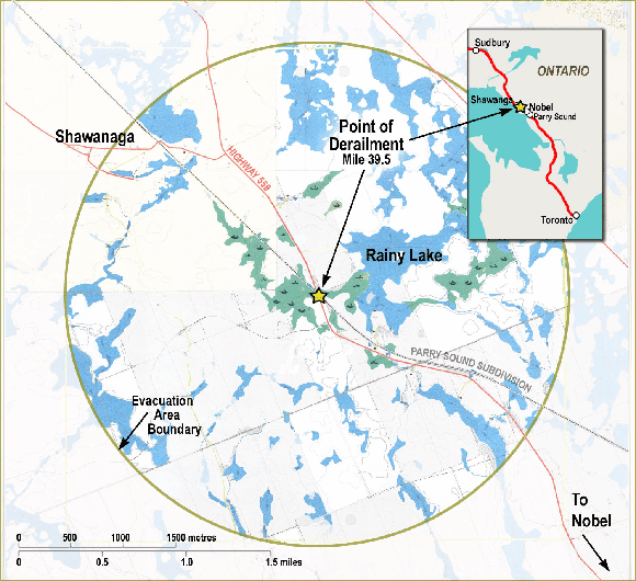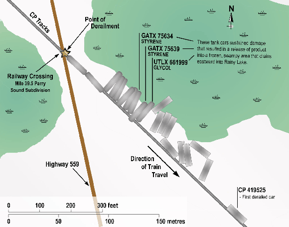 At approximately 0830 eastern standard time on 13 February 2003, Canadian Pacific Railway freight train 938-12, proceeding southward at 42.5 mph, derailed 21 cars at Mile 39.5 of the Parry Sound Subdivision near Nobel, Ontario. The derailed cars included 10 loaded tank cars. Two of the derailed tank cars contained methanol (UN 1230); five contained styrene monomer, inhibited (UN 2055); and three contained non-regulated ethylene glycol. Three tank cars were breached, resulting in the release of approximately 100 tons of ethylene glycol and 130 tons of styrene monomer. A total of 180 people living within 1.5 miles (2.5 km) of the site were evacuated. Two people sustained minor injuries. Minor amounts of released product migrated to Rainy Lake, approximately 450 metres east of the derailment.