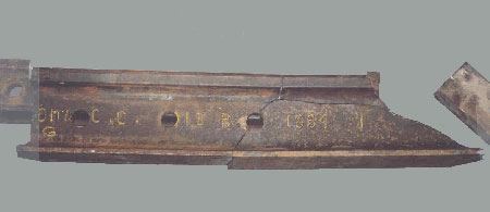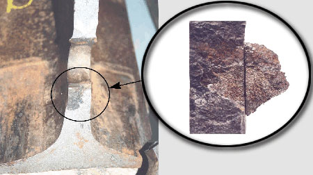 - The third piece was a seven-inch section of rail head that had separated from the web of the second piece and mated perfectly to the south-end rail head of the first piece. The third piece displayed fracture surfaces with brittle characteristics typical of catastrophic failure.