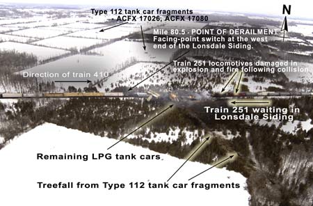 On 21 February 2003, at approximately 0540 eastern standard time, Canadian Pacific Railway (CPR) freight train 410-16, travelling eastward at 42 miles per hour, derailed 21 cars at Mile 80.5 on the main track of CPR's Belleville Subdivision. Seven of the derailed cars contained liquefied petroleum gas, some of which collided with the lead locomotive of CPR train 251-19 waiting in the siding at Lonsdale. The tank car shells were breached, and the cars subsequently exploded.