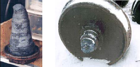 The wheels, axle, and recovered components from the burnt-off journal on axle 122 of the 27th car (see Photo 2) were sent to the TSB Engineering Laboratory for analysis. Both wheels were CJ33 type and had been manufactured in February 1985. No significant grease spatter was observed on either wheel plate. The wheel set "back to back" measurement was within specified limits. There were no significant shelling defects or other tread defects on either wheel.