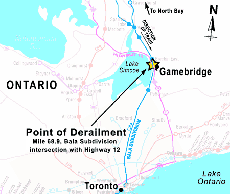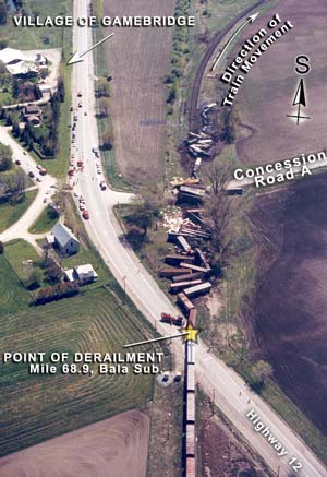 At 1144 eastern daylight time on 21 May 2003, Canadian National (CN) train A-450-31-21, travelling southward from North Bay, Ontario, destined for Toronto, Ontario, derailed 49 rail cars south of the Highway 12 public crossing in the village of Gamebridge, Ontario, Mile 68.9 of the CN Bala Subdivision. The derailed equipment included 21 tank cars loaded with sulphuric acid, 2 empty box cars, and 26 box cars loaded with paper.