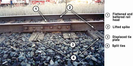 There were several joints on both rails just north of the crossing. One joint on the west rail was shimmed. An 18-foot rail plug was fully bolted in place on the east rail and both of the joints were battered. One joint was supported on two ties with only one tie plate (see Photo 2); the other had worked itself off the tie. A set of splice bars had also been applied to the east rail where the rail head was flattened and battered. Four bolts in the outer holes held the splice bars in place. There was also evidence of mud pumping and poor drainage, particularly at the joints north of the crossing (see Photo 3). An examination of several other road crossings within 10 miles of the derailment site revealed similar conditions.