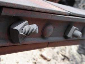 The running rail and guard rail were found hanging from the remaining portion of the bridge, twisted and tangled within the wreckage. The rails were broken in several pieces at the west end of the bridge. Scrapes and impact marks (see Photo 3) on the side of the south guard rail and on the head on the north guard rail indicate that the lead locomotive had contacted the guard rails approximately 145 feet from the east dump wall.