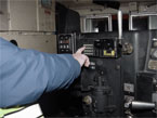 Within the GE AC4400CW cab, a seated individual of average height would have to stretch approximately 6 inches with his left hand or 12 inches with his right hand to reach the locomotive radio. In comparison, because the radio in the GM SD-90 MAC is located to the right of the locomotive engineer's chair (above the window) and the radio in the GM SD-40-2 is incorporated into the standard control stand (to the left of the locomotive engineer's chair), these radios can be reached more easily than those in the GE cab. Photographs illustrating the location of each radio and the ease of reaching the radio with the right hand are shown below.