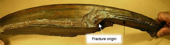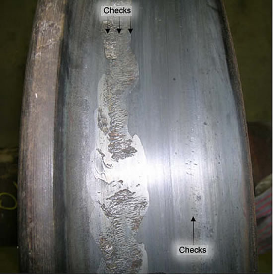 Shelling on the running surface of wheels is a fatigue failure of the tread due to the repeated overstressing by high rolling contact fatigue.Footnote 3 The sources of rolling contact fatigue can include heavy braking and heavy tractive effort on locomotives. Although the source of the shelling was not identifiable in this occurrence, the fracture initiated from the bottom of the shell and propagated in opposite directions perpendicular to the tread surface to an overall length of 27 inches until the piece separated from the wheel (see photos 3, 4 and 5).