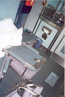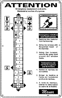 Specially designed windows provide occupants with emergency egress alternatives to the exit doors at the ends of the cars. Emergency exit windows are intended to remain freely accessible at all times. The armchair design increased the risk that an emergency exit would not be accessible. These large, heavy folding armchairs (weighing in excess of 66 pounds each) were not secured to the floor and slid around the sleeping compartments in cars 8717, 8340, and 8319. These chairs could have barricaded the doors, which are inward opening, and could have restricted access to the emergency exit windows in some of the sleeping compartments (see Photo 4).