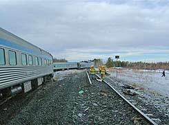 On 31 January 2005 at 1310 mountain standard time, VIA Rail Canada Inc. passenger train No. 1, proceeding westward, was struck by a southbound logging truck on Secondary Highway 751 at the public crossing, Mile 92.26 of the Canadian National Edson Subdivision. The crossing was protected by flashing lights, signals and bells, and active advance warning signs located approximately 104 m in advance of the crossing. As a result of the collision, both locomotives and all nine passenger cars derailed. The driver of the truck sustained serious injuries and was transported to hospital. All 86 passengers and 16 crew were evacuated to the local community centre. One passenger and one passenger service crew member sustained minor injuries. Approximately 6500 litres of fuel was lost from the lead locomotive.
