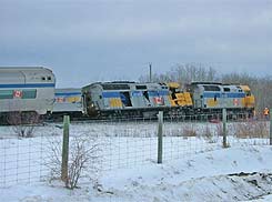 Once the train came to rest and the crew determined that it was safe to do so, the passengers were evacuated. Both passengers and VIA crew were transported a short distance to the MacKay Community Hall where an emergency shelter was set up. Ambulance crews were at the accident scene. They also set up a first-aid station in the hall and attended to all passengers as they arrived. Two minor injuries resulted from the collision. One passenger received a minor facial abrasion from luggage that fell from an overhead rack that was not enclosed or equipped with restraint netting. One VIA employee received a minor injury from a counter corner when he fell into it during the derailment. VIA organized alternate transportation for the passengers to their destination.