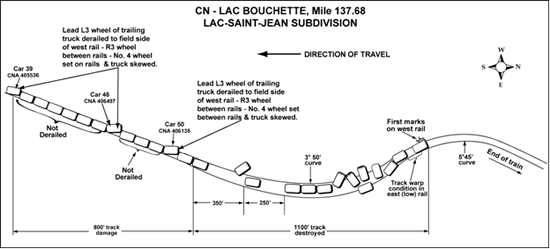The first three derailed cars remained upright. Their trailing trucks were skewed with their leading wheel set derailed to the field side of the west rail. The trailing wheel set of the third car had fallen between the rails. The 51st to 65th cars came to rest in various positions along the right-of-way (see Figure 2).