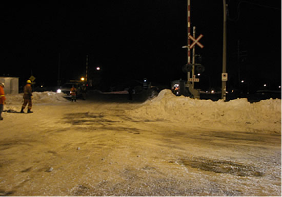 During snow-clearing operations, most of the snow was pushed to the side of the road and formed snow banks that were up to four feet high. The 3e Avenue roadway width was reduced due to the presence of snow banks. The crossing surface was snow covered and icy. Tire marks were observed on the side of a snow bank located on the southeast corner of Exit 35 and 3e Avenue near the CN crossing mast and gate (see Photo 1).