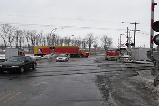 About 43 freight trains, 24 passenger trains, and 22 commuter trains per day operate over the crossing. Highway traffic consists of approximately 4700 vehicles a day, about 70 of which are either heavy trucks or tractor-trailers. Heavy truck and car traffic is expected to increase in the future due to industrial and residential expansion. The total cross productFootnote 2 for the crossing is approximately 420 000 (55 per cent for the Kingston Subdivision and 45 per cent for the Vaudreuil Subdivision).