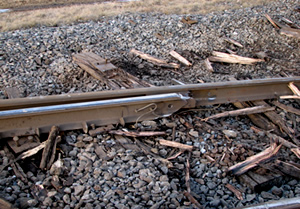 The tie immediately beneath the heel block joint was severely damaged during the derailment; however, it showed signs of previous degradation and had several old longitudinal splits (see Photo 1). This tie was the only switch tie that did not shift laterally during the derailment.