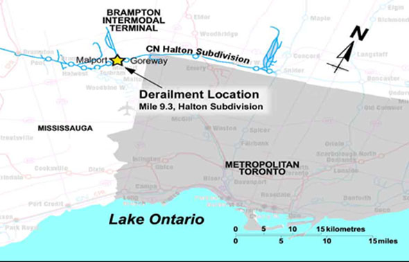 The Halton Subdivision extends eastward from Mile 49.5, the junction with the Oakville Subdivision in Burlington, Ontario, to Mile 0.0, where it joins the York Subdivision in Toronto. In the vicinity of the derailment, the Halton Subdivision consists of double main track with a maximum permissible speed of 50 mph for freight and passenger trains. At the time of the derailment, there were no speed restrictions in the vicinity of the derailment.