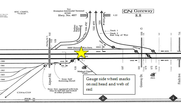 The derailed cars were stretched east to west along the north main-line between the crossing at Goreway Drive and the signal structure at Mile 9.3. The derailed cars did not obstruct the south main track.